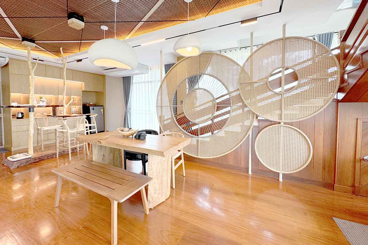 วัสดุเน้นความยั่งยืนและเป็นธรรมชาติ เช่น ไม้รีไซเคิล หิน เส้นใยพืช ที่ให้ความอบอุ่นและเชื่อมโยงกับธรรมชาติ ส่วนโทนสีเน้นกลุ่มสีเอิร์ธโทนและสีธรรมชาติ (เช่น เบจ เทาอ่อน เขียวมะกอก) เพื่อสร้างความสงบ ผ่อนคลาย สบายตา สามารถเพิ่มความน่าสนใจและความสดใสด้วยการแทรกสีทอง สีฟ้าพาสเทล หรือเหลืองอ่อน