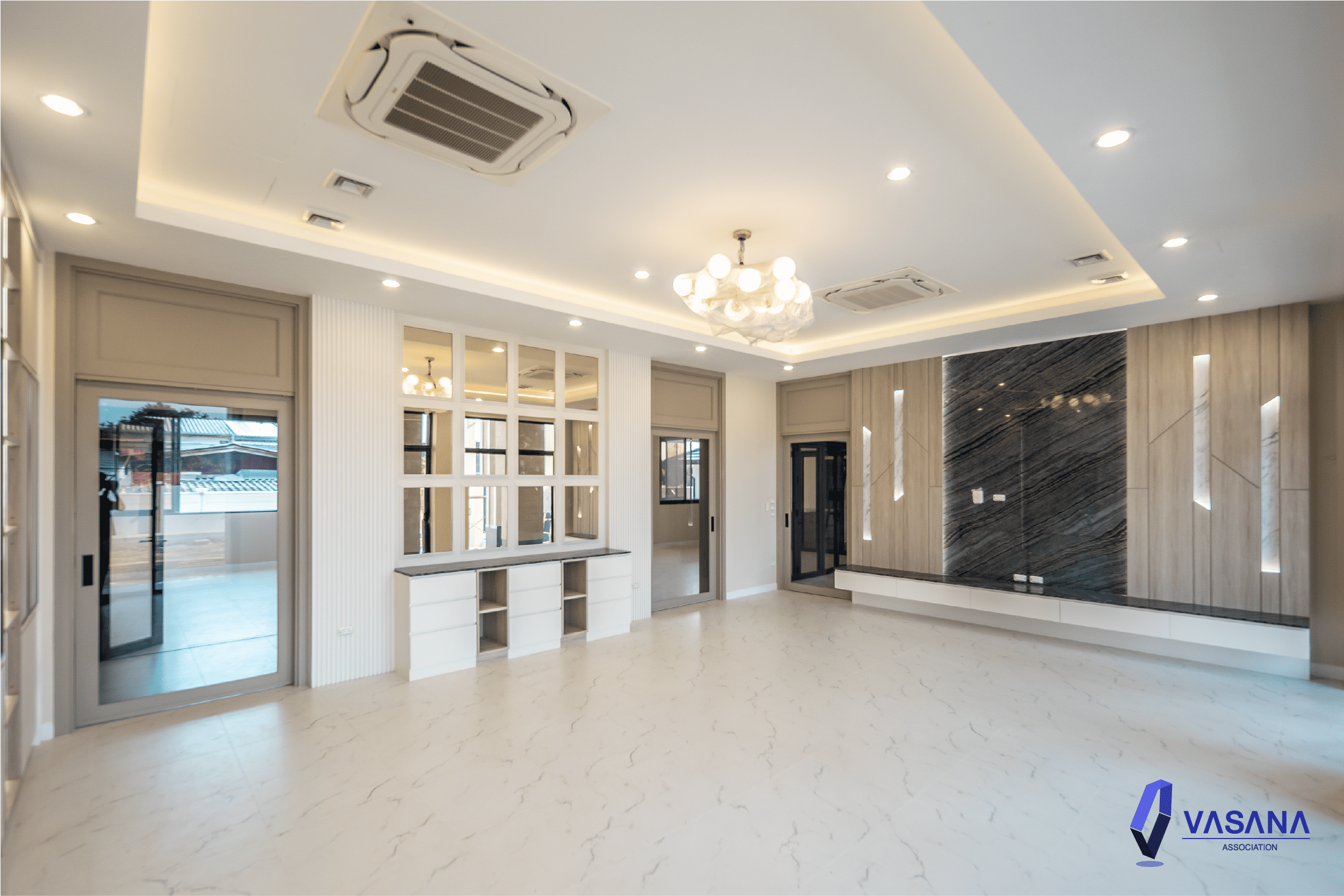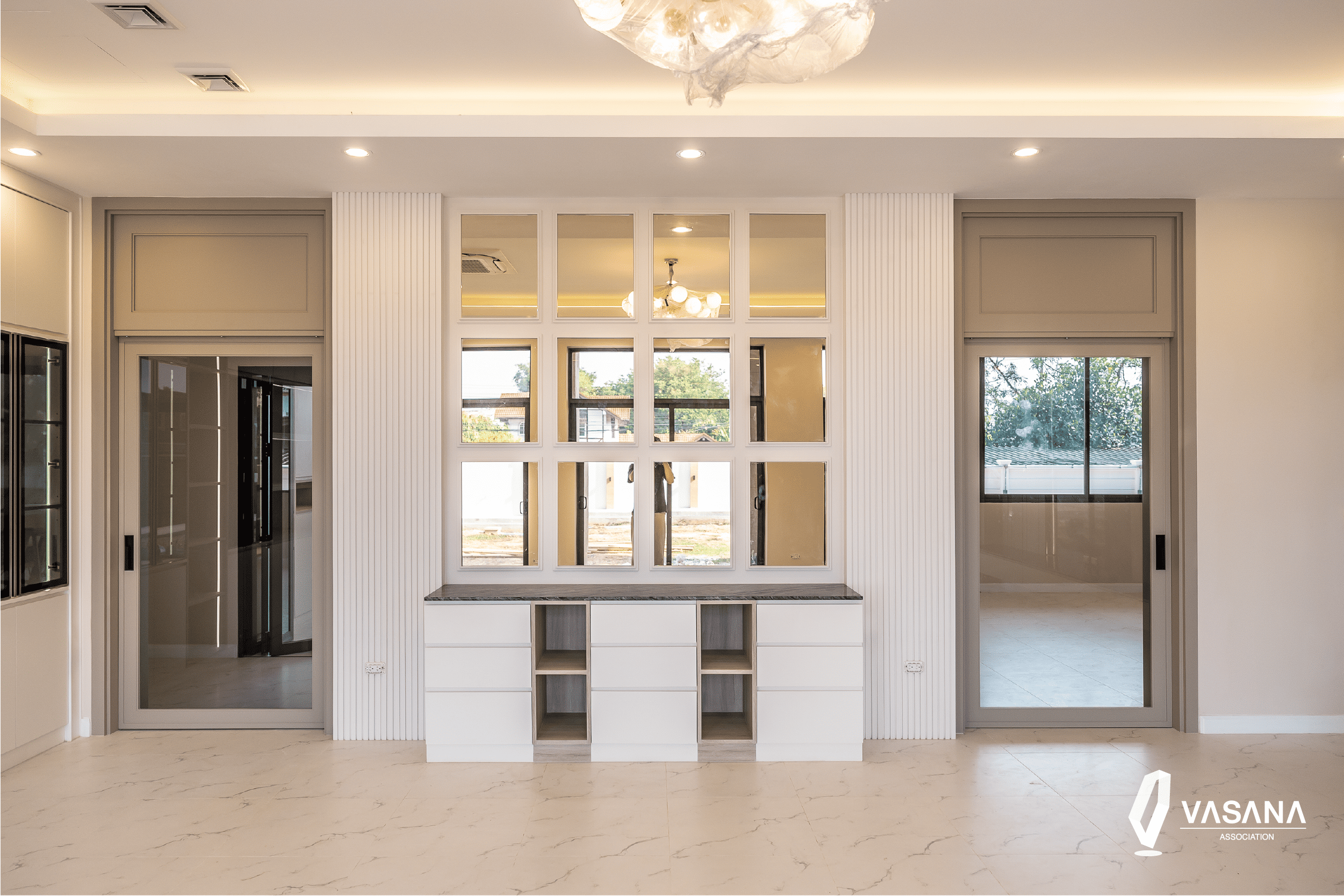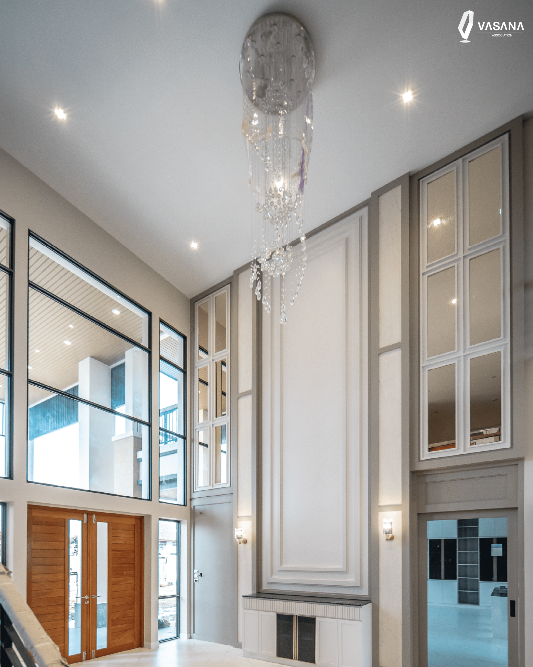 ทีมดีไซน์เนอร์ ได้ออกแบบโดยใส่รายละเอียดความเป็นตัวตนของสมาชิกในครอบครัวลงไปด้วย ทำให้บ้านหลังนี้มีหลากหลายสไตล์อยู่ด้วยกัน โถงทางเข้าบ้านมี Double Volume Space สูง 6 เมตร ทำให้บ้านดูโปร่ง มีพื้นที่กว้าง ในแบบของบ้านในสไตล์ Modern ตามมาด้วยห้องนั่งเล่นและห้องรับแขกที่มีความ Classic Luxury ซึ่งตกแต่ง ผนัง และ Top ด้วยหินอ่อนร่วมกับไม้และกระจก