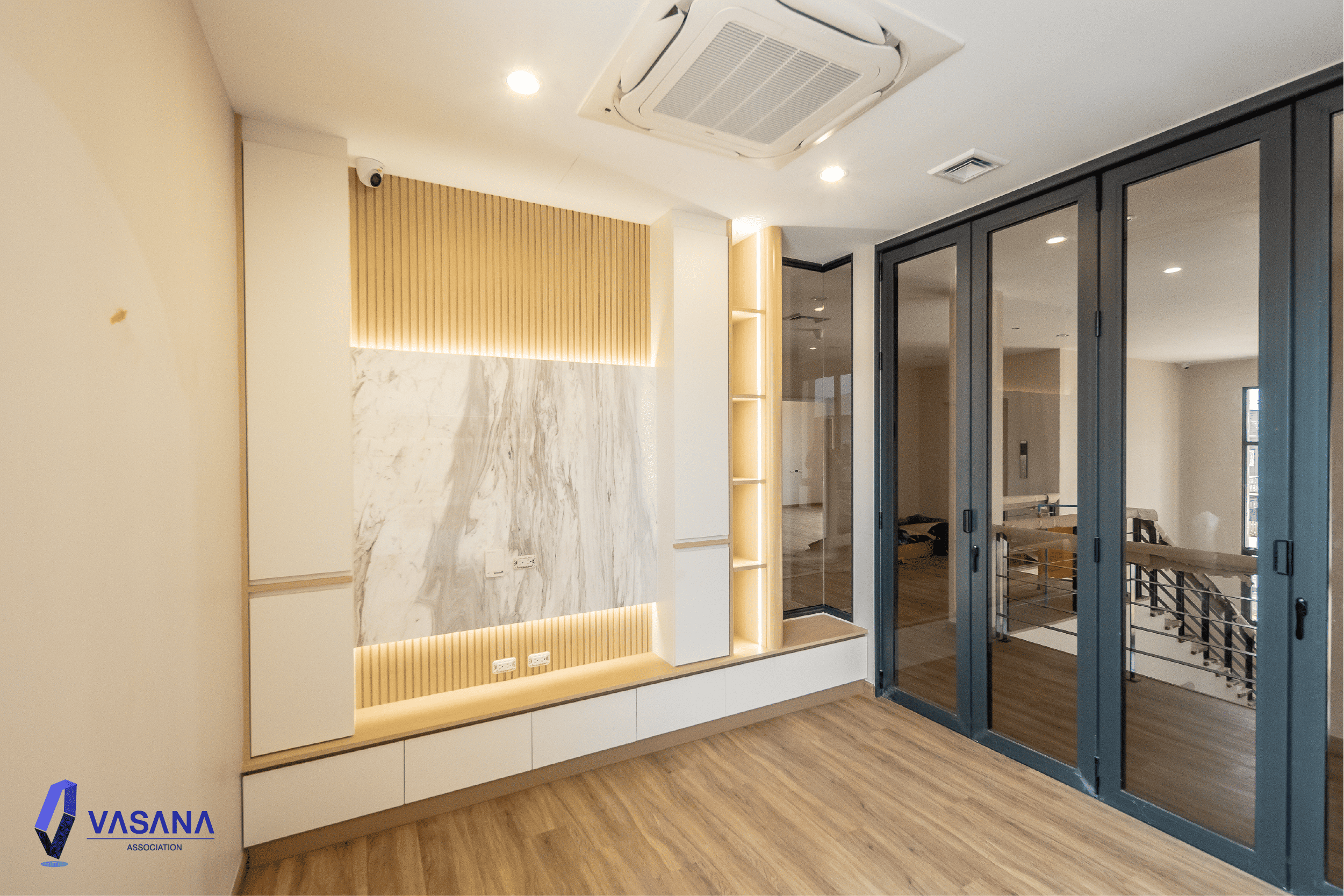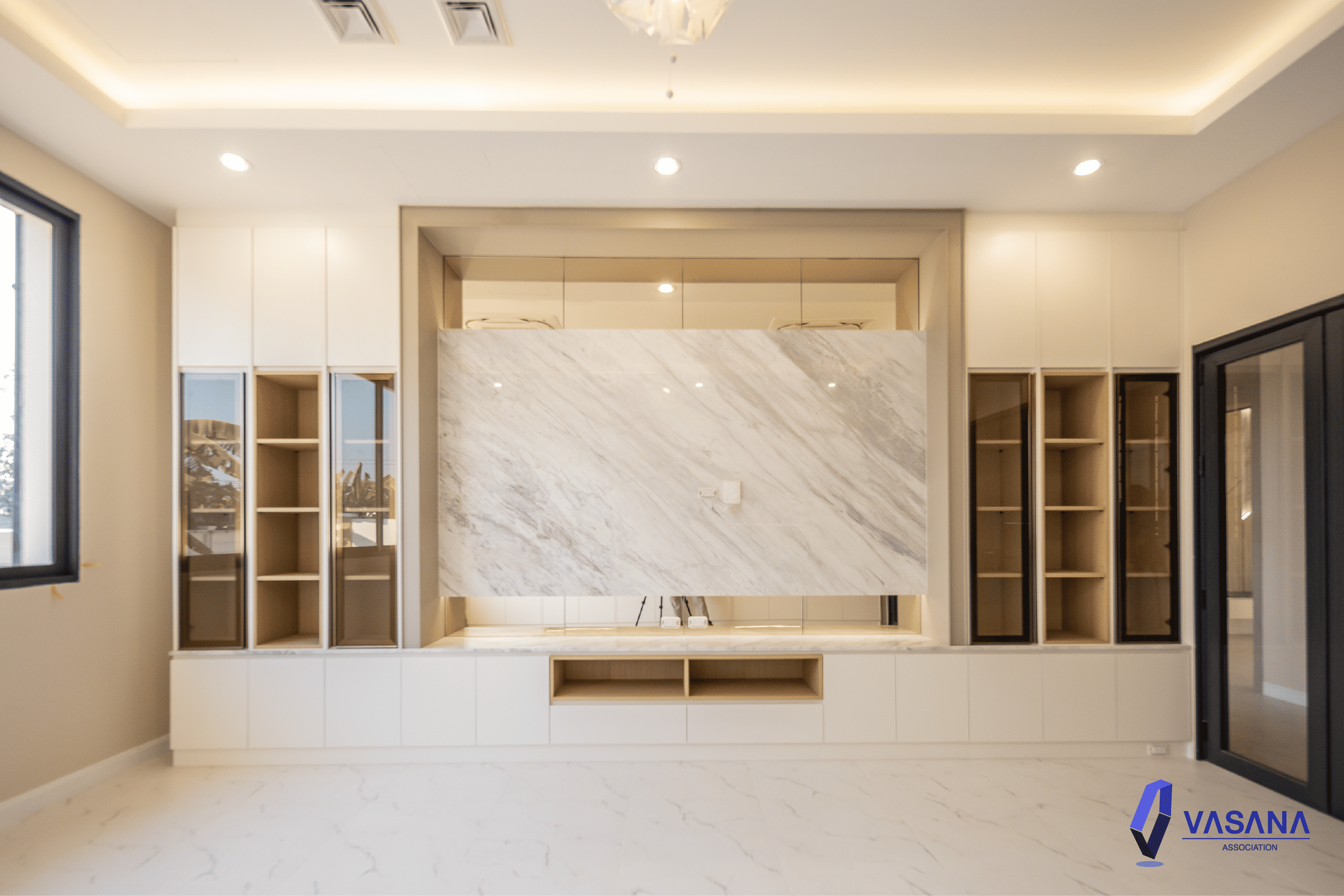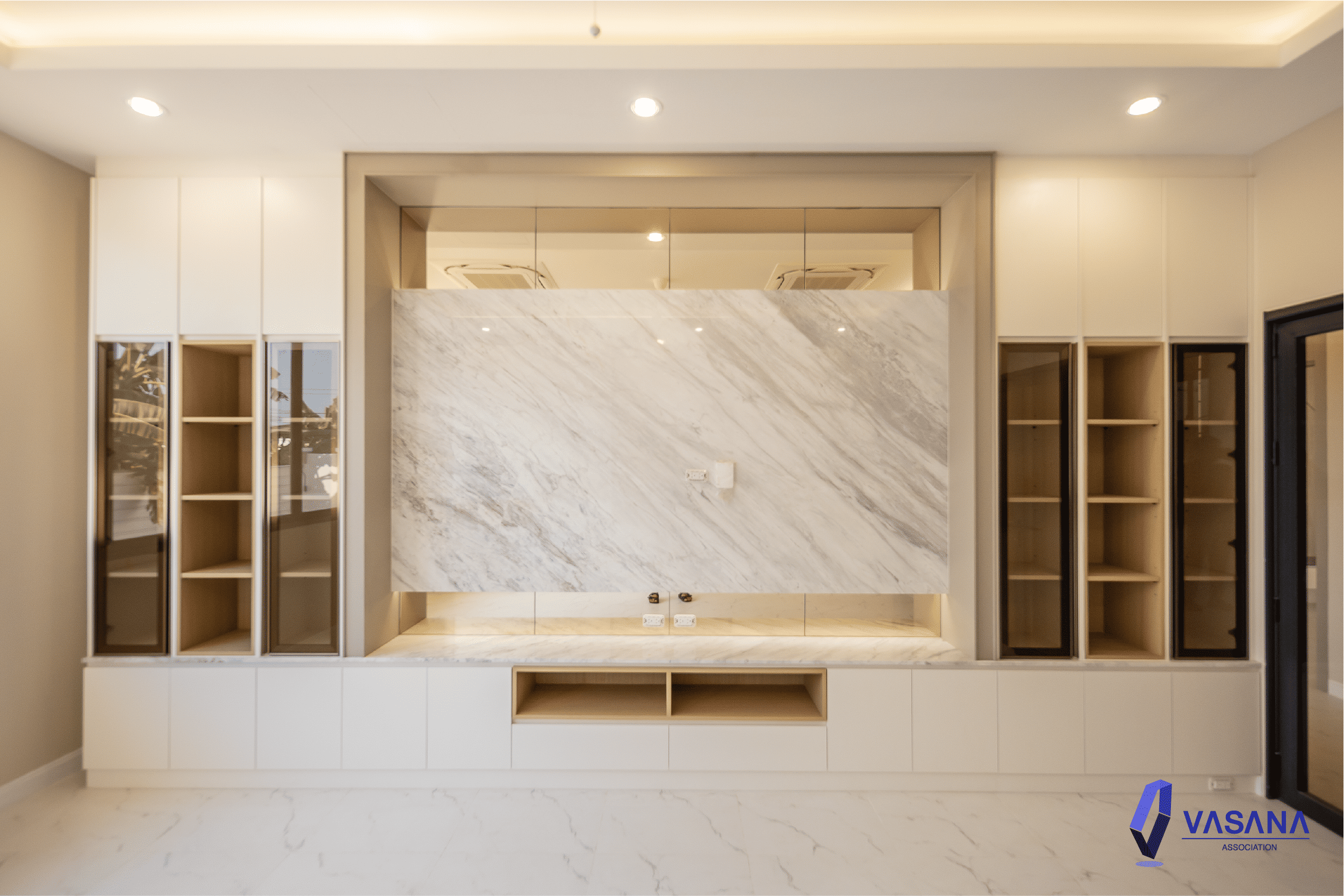 ทีมดีไซน์เนอร์ ได้ออกแบบโดยใส่รายละเอียดความเป็นตัวตนของสมาชิกในครอบครัวลงไปด้วย ทำให้บ้านหลังนี้มีหลากหลายสไตล์อยู่ด้วยกัน โถงทางเข้าบ้านมี Double Volume Space สูง 6 เมตร ทำให้บ้านดูโปร่ง มีพื้นที่กว้าง ในแบบของบ้านในสไตล์ Modern ตามมาด้วยห้องนั่งเล่นและห้องรับแขกที่มีความ Classic Luxury ซึ่งตกแต่ง ผนัง และ Top ด้วยหินอ่อนร่วมกับไม้และกระจก