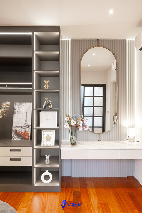 ตัดความโดดเด่นด้วยไฟซ่อนตามผนัง ลายหินอ่อนของ Top ต่างๆ รวมถึงการทำสีพ่น texture ของผนังที่ทำให้บ้านดูมีมิติ ไม่เรียบง่ายจนเกินไป